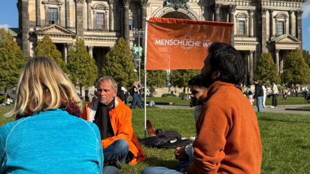 Am Freitag versammelten sich Mitglieder und Sympathisanten in Berlin um für MENSCHLICHE WELT an der großen Friedensdemo unter dem Motto “Nie wieder Krieg!” teilzunehmen.